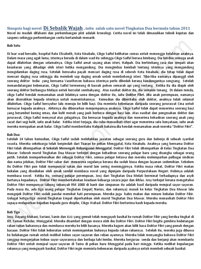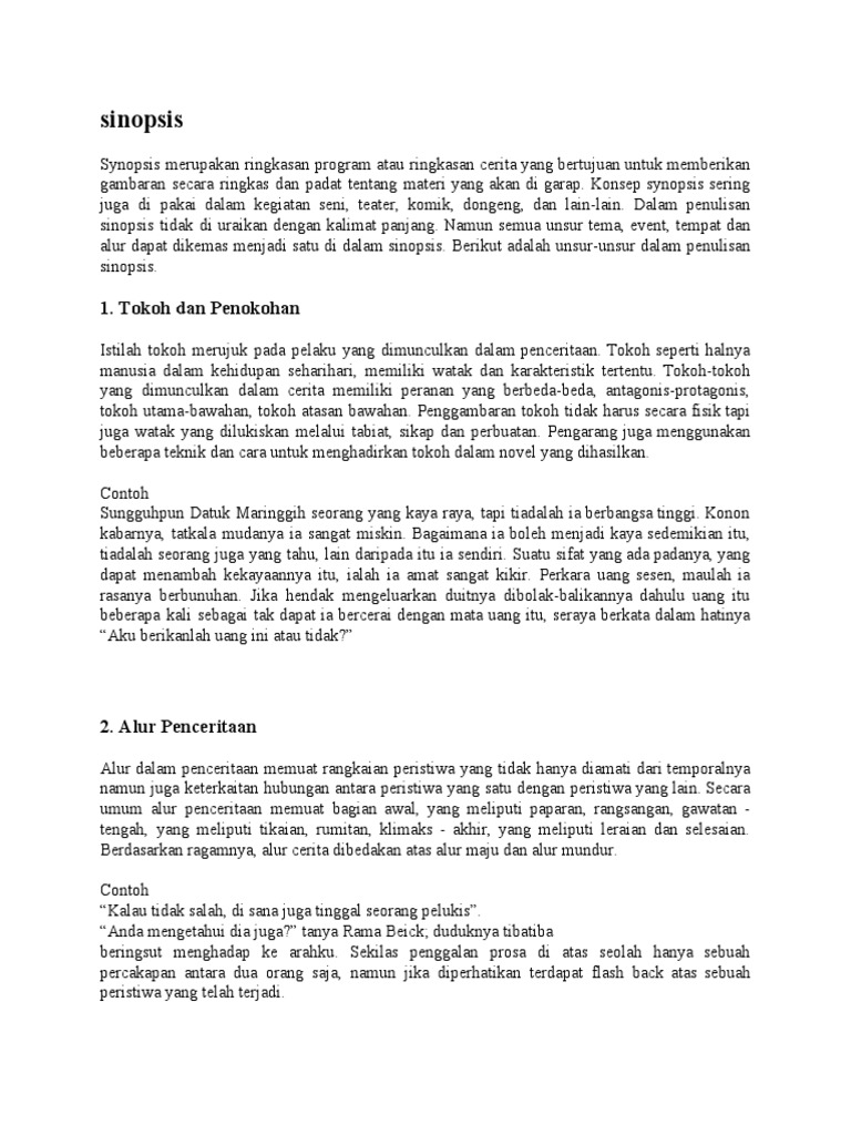 Sinopsis Bagi Novel Di Sebalik Wajah from imgv2-2-f.scribdassets.com Sinopsis memberikan gambaran tentang alur cerita atau poin utama dan faktor penentu lainnya dari karya tersebut. Gunakan kalimat yang jelas, efektif, dan menarik sehingga mudah dipahami dan urutan sinopsisnya dapat menggambarkan apa yang ingin anda katakan. Berfungsi sebagai prolog atau epilog untuk sebuah karya tulis yang akan disajikan atau dipentaskan. Saat menulis, ringkasan umumnya dibatasi oleh jumlah halaman, misalnya dari halaman 1 hingga 3 atau seperlima dari teks asli. See full list on saintif.com Kembangkan ide paling penting yang ditemukan dalam bentuk ringkasan pendek dan juga jelas. Perhatikanlah alur yang digunakan perhatikan alur yang digunakan dalam teks. Jadi, sinopsis adalah ringkasan isi naskah cerita yang menggambarkan isi cerita dari suatu karya baik itu buku, film atau pementasan dari awal sampai akhir, sehingga membentuk sebuah tema cerita, ditulis secara lebih singkat, padat serta jelas.
